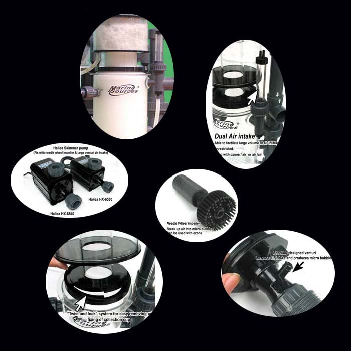 Venturi air intake. It not only can increase the air intake volume greatly and enhance the skimmer efficiency, but also can keep the pump running silence.